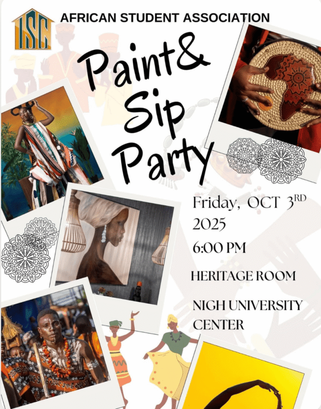 The University of Central Oklahoma’s African Student Association (ASA) is set to host a Paint & Sip Party on Friday, Oct. 3, at 6 p.m. in the University Center Heritage Room.