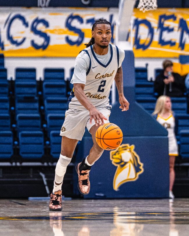 UCO senior forward #2 Josh Nwankwo dribbling the ball up the court. (HUNTER GEORGE/THE VISTA)