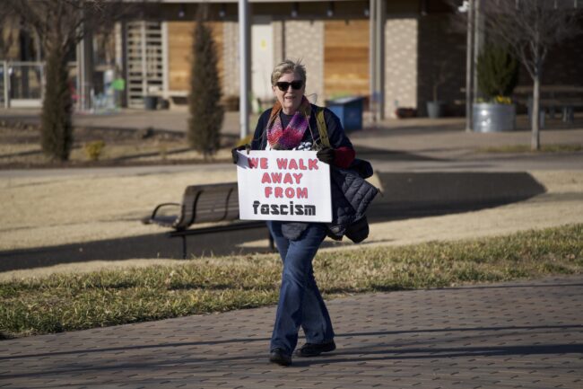 Woman holding a sign that reads “We Walk Away From fascism,” Jan 20 (Cameron Estes/The Vista)