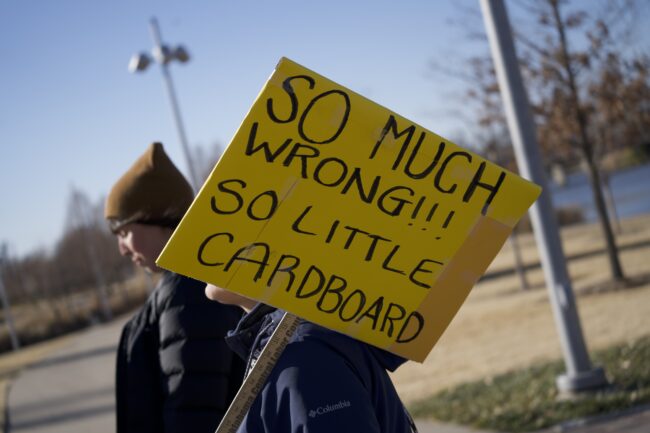 Protestor holds a sign that reads, “So much wrong!!! So little cardboard,” Jan. 20 (Cameron Estes/The Vista)