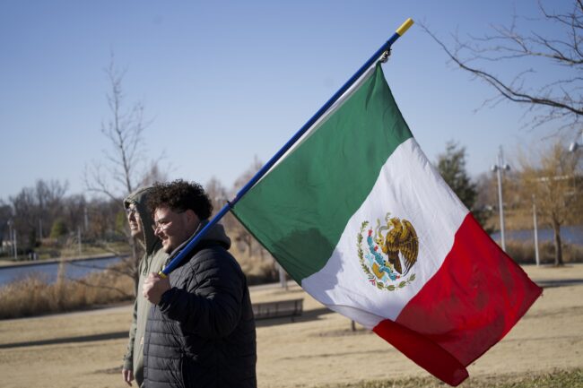 Man holds the Mexican flag as he marches during the Free America walkout, Jan. 20 (Cameron Estes/The Vista)