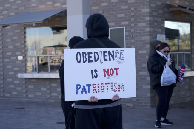 Masked person holding a sign that reads “Obedience is not Patriotism” with the I, c, and e in Obedience underlined, Jan. 20 (Cameron Estes/ The Vista)