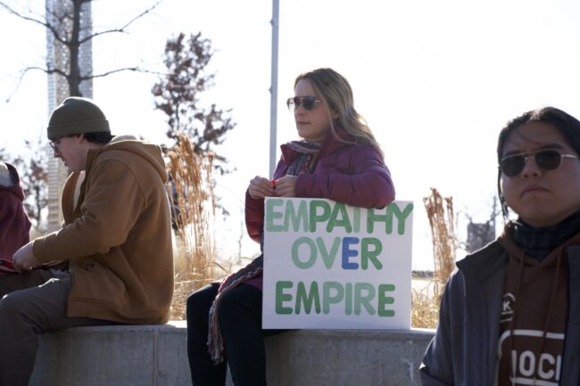 Woman holds sign that reads, “Empathy over Empire,” Jan. 20 (Cameron Estes/The Vista)