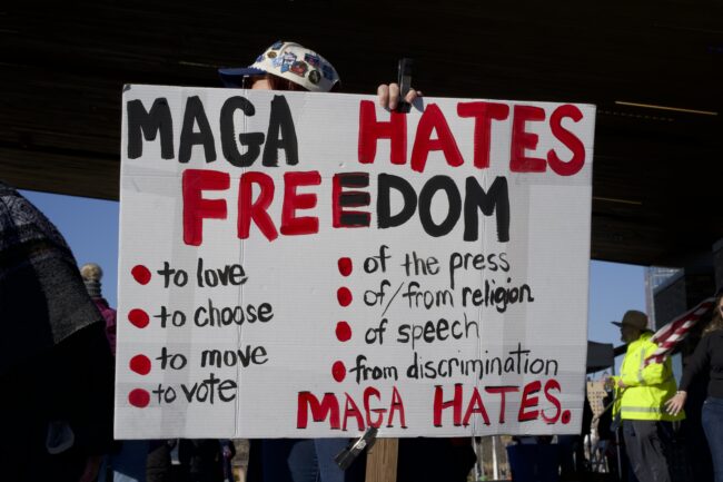 A person holds a sign that reads, “MAGA hates freedom,” Jan. 20 (Cameron Estes/The Vista)