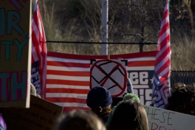 Protestors holding signs saying “Abolish ICE” and “Free America,” Jan. 20(Cameron Estes/The Vista)