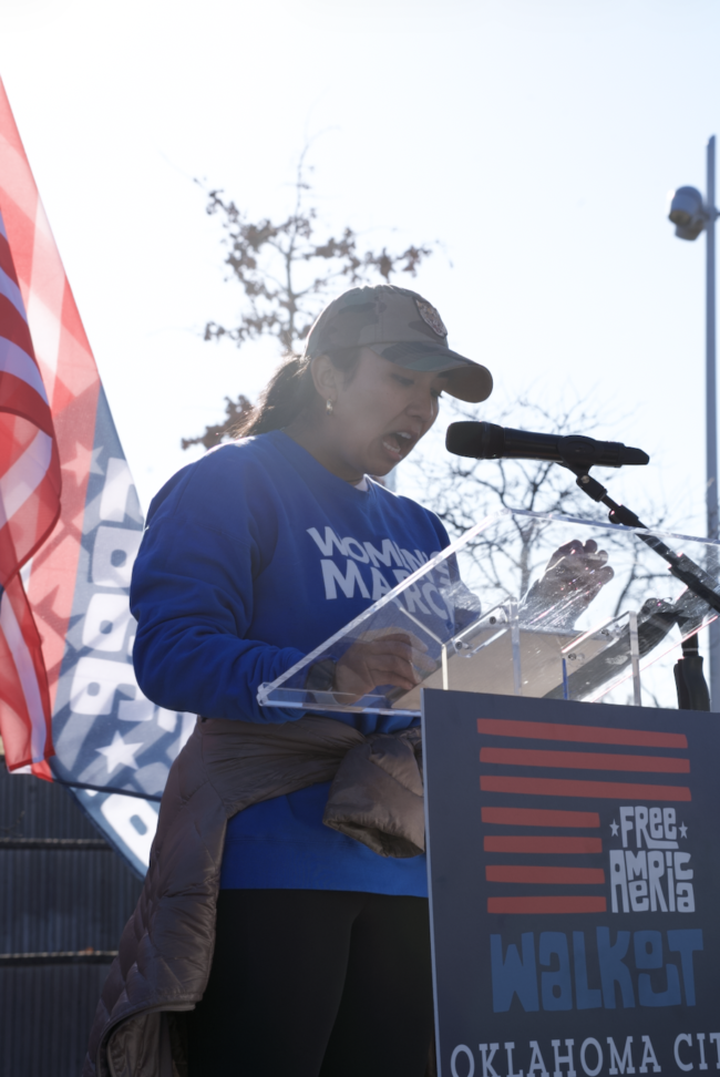 Nicole Maldonado, the organizing manager for ACLU of Oklahoma, speaks at Free America Rally, Jan. 20 (Cameron Estes/The Vista)
