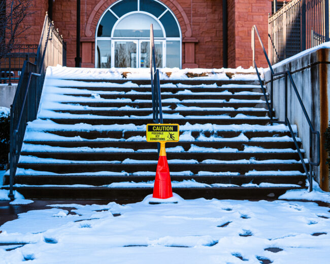 Snowy Steps with caution sign (Hunter George/The Vista)