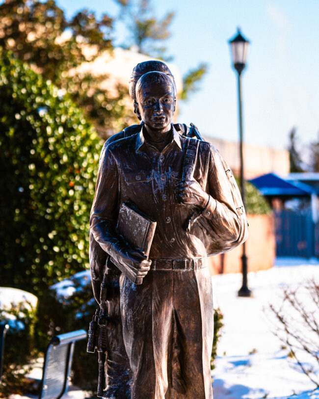 “Tired and True” statue after the snow storm (Hunter George/ The Vista)