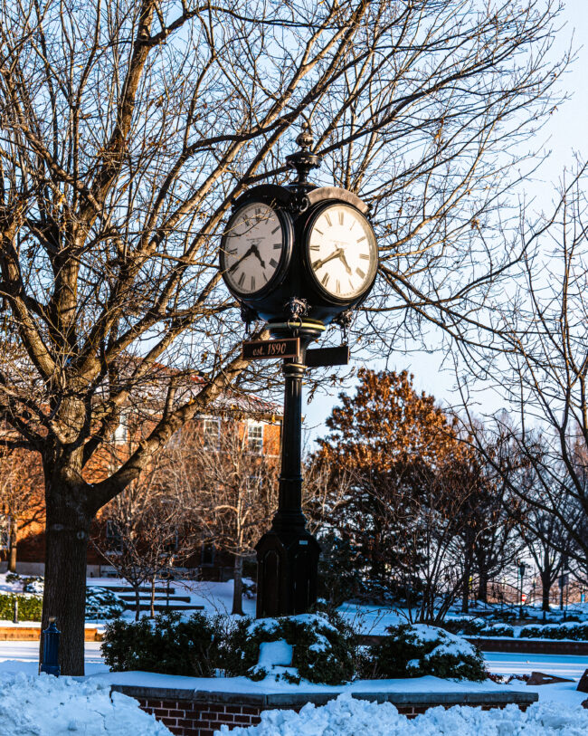 UCO clock after weekend snow storm (Hunter George/ The Vista)