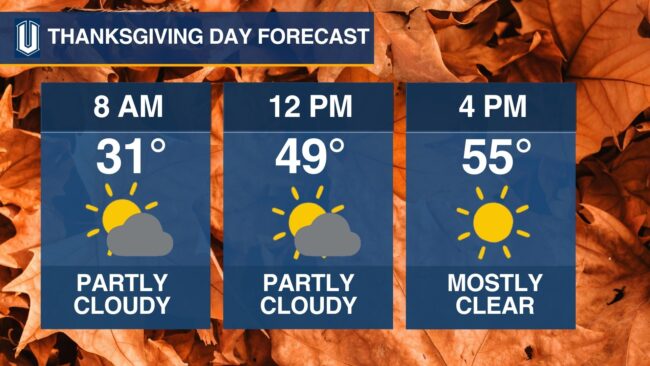 Thanksgiving Day will bring ideal travel and outdoor conditions statewide. Forecasts call for partly cloudy skies and temperatures in the mid-50s, making it one of the most pleasant days of the week.