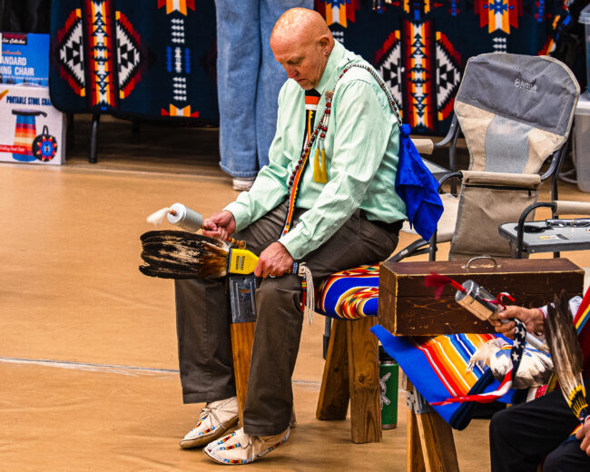 A man in Gourd Dance regalia dances during the opening of the Gourd Dance (Hunter George/The Vista)