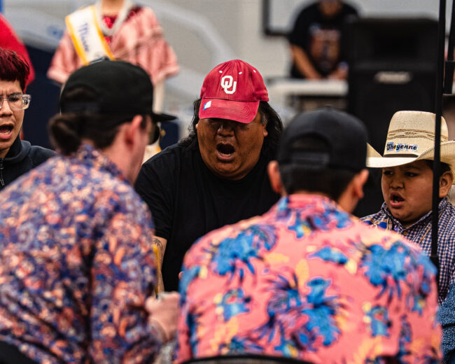Anthony Yahola, lead singer for the host drum Full Metal Jacket, leads a song during the 52nd Annual UCO Powwow (Hunter George/The Vista)